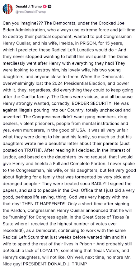 Trump continues abusing his pardoning power, and publicly admits his corruption. He pardoned Democrat Henry Cuellar, then had a meltdown after Cuellar announced he was still running for Congress as a Democrat and called him disloyal because the pardon was meant to be a bribe.
