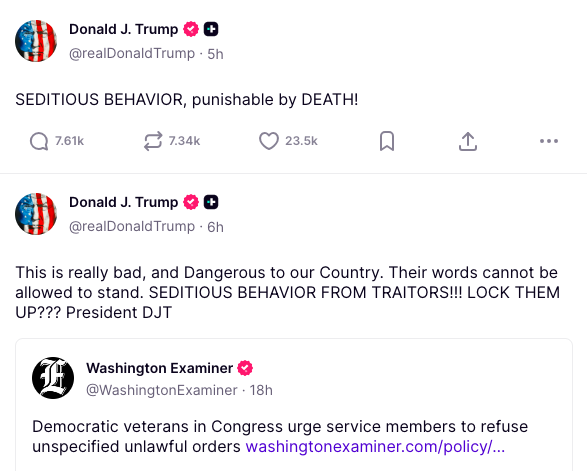 Another source: “Trump calls for arrest of ‘seditious’ Democrats who told troops their duty is to uphold the Constitution” https://www.independent.co.uk/news/world/americas/us-politics/trump-arrest-democrats-troops-illegal-orders-b2869176.html